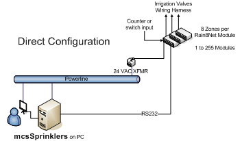 The direct connect architecture provides the highest reliability and lowest acquisition cost. This configuration, however imposes a requirement that a wired connection (3-wire RS232) exist between the computer and the location where the valve control hardware is installed. The valve control hardware consists of stackable modules. Each module has the capability to control eight valves and/or pumps per module. Note now only Rain8Net PRO models accept one discrete input as a counter or as a switch. Included is a 24VAC 20VA transformer, two 9-pin RS232 adapters, 6ft flat RS232 cable, and RS-485 interconnect cables between each Rain8Net+ module. The software consists of mcsSprinklers in the Basic, Standard, or Professional version which provides capability to run on a single computer and remote access via internet or LAN access. Direct Connect Configuration