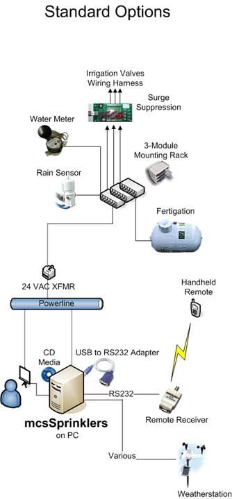 Standard options that apply to most configurations can be added to enhance the irrigation control. Some computers have insufficient RS232 ports, yet have USB ports. A USB to RS232 adapter can be used to gain the necessary RS232 interface