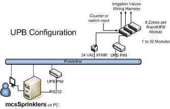 The powerline architecture provides the lowest installation effort with reliable operations and modest acquisition cost. The powerline is used as the physical connection between the valve control electronics and the control software running in the computer. Universal Power Bus (UPB) adapters are used to make the electrical connection with the powerline on both the computer side and the valve control electronics side. The valve control hardware consists of stackable modules. Each module has the capability to control eight valves and/or pumps per module as well as accept one discrete input as a counter or as a switch. Included is a 24VAC 20VA transformer, two UPB powerline adapters, two RS232 UPB adapter cables, and RS-485 interconnect cables between each Rain8UPB PRO module. The software consists of mcsSprinklers in the Basic, Standard, or Professional version which provides capability to run on a single computer and remote access via internet or LAN access.