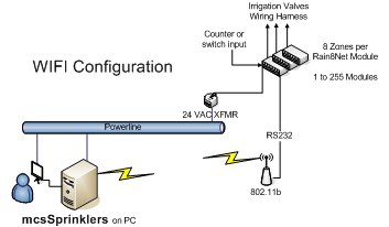 The WiFi connect architecture provides high reliability and installation convenience. Rain8Net+ modules are used for valve control and an 802.11b WiFi to RS232 access point is used to provide the connection to the PC. The PC or router on the LAN is assumed to support 802.11b communications. The valve control hardware consists of stackable modules. Each module has the capability to control eight valves and/or pumps per module. Note now only Rain8Net PRO models accept one discrete input as a counter or as a switch. Included is a 24VAC 20VA transformer, 802.11b WiFi to RS232 access point, 9-pin RS232 adapters, 6ft flat RS232 cable, and RS-485 interconnect cables between each Rain8Net+ module. The software consists of mcsSprinklers in the Basic, Standard, or Professional version which provides capability to run on a single computer and remote access via internet or LAN access.