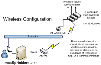 The wireless architecture provides through-wall wireless connectivity for close proximity connections between the valve control electronics and computer. The RF communications is one-way so no assurance that commands are received or the current status of the valves. Timeouts within the Rain8Wireless modules prevent excessive ON time. The valve control hardware consists of stackable modules. Each module has the capability to control eight valves and/or pumps per module as well as accept one discrete input as a counter or as a switch. Included is a 24VAC 20VA transformer, CM17A PC to RF adapter, RF antenna and mounting bracket, coax cable, and module interconnect cable with each additional Rain8Wireless module. The software consists of mcsSprinklers in the Basic, Standard, or Professional version which provides capability to run on a single computer and remote access via internet or LAN access.