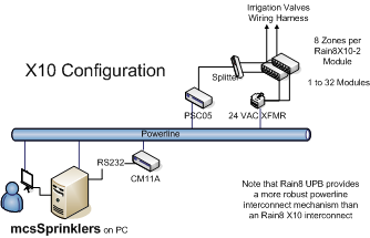 The powerline architecture using X10 provides the lowest installation effort and modest acquisition cost. The powerline is used as the physical connection between the valve control electronics and the control software running in the computer. X10 adapters are used to make the electrical connection with the powerline on both the computer side and the valve control electronics side. The valve control hardware consists of stackable modules. Each module has the capability to control eight valves and/or pumps per module. Included is a 24VAC 20VA transformer, CM11-A powerline adapter, one PCS05 powerline adapter per two Rain8X10-2 modules and splitter for each pair of Rain8X10-2 modules. The software consists of mcsSprinklers in the Basic, Standard, or Professional version which provides capability to run on a single computer and remote access via internet or LAN access. Powerline (X10) Configuration